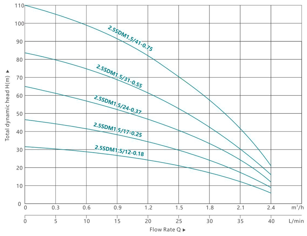 | 2,5SDM 1,5/12-0,18 | 2,5SD1,5 / 12-0,18 | 0.18 | 0.25 | H(m) | 32 | 30 | 28 | 26 | 24 | 21 | 17 | 13 | 6 |