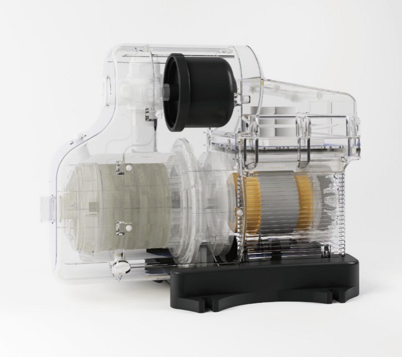 Motor elétrico PMSM IE4 (eficiência energética primária). Ajuste automático da potência necessária. Comparado com motores assíncronos da mesma potência, a economia de energia é superior a 30%.