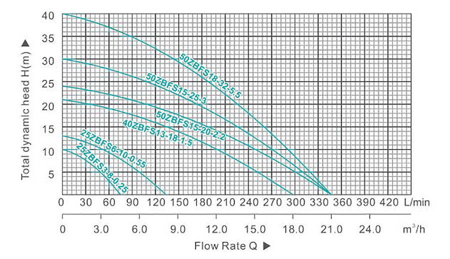 | 50ZBFS18-32-5.5 | 5.5 | 7.5 | 21 | 40 | 8 | 2"×2" | 90 | 590×225×390 |