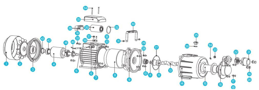 | 10 | Selo mecânico | 21 | Tampa de entrada | 32 | Anel "O" | 43 | Anel aberto | |||||||