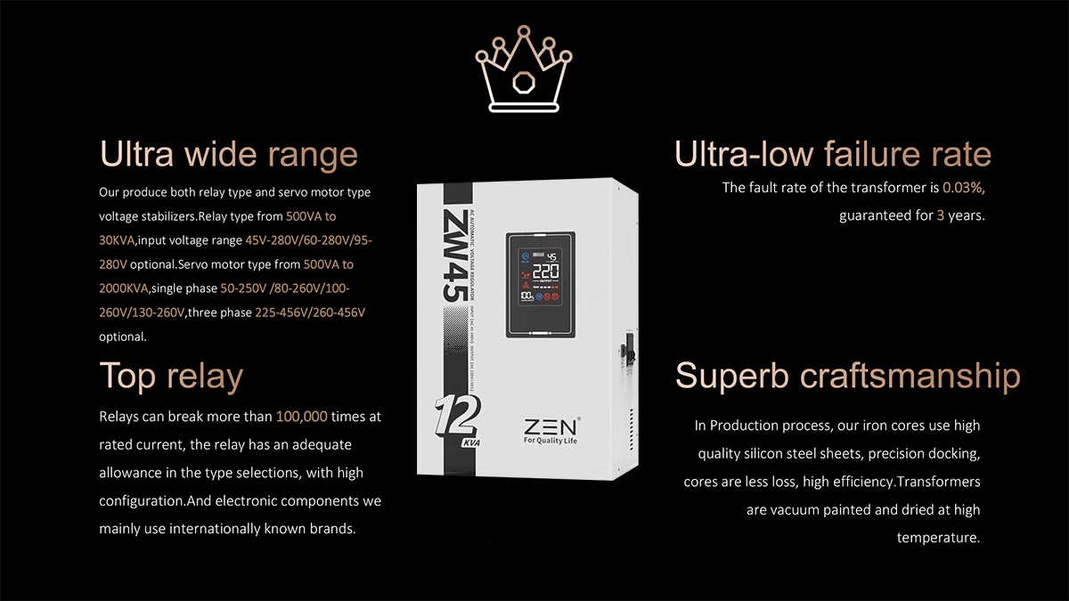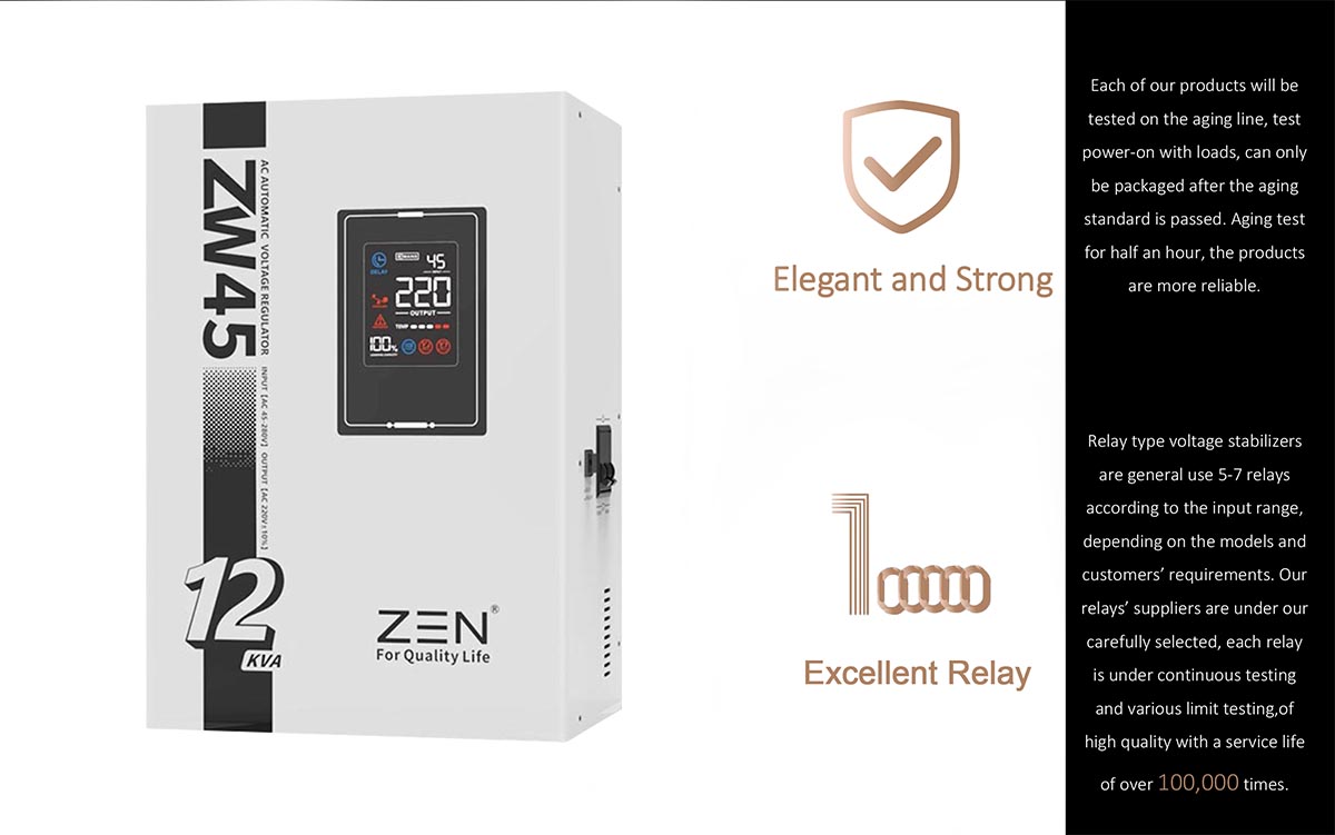 A marca ZEN Machinery é fabricante líder de regulador automático de tensão CA ZW45 1KVA a 30KVA na China. Recursos do produtoEste modelo é um regulador de pequena tensão de 220 V totalmente automático projetado para display digital LED portátil. Possui características de tamanho pequeno, peso leve, ajuste rápido de tensão, sem distorção de forma de onda e assim por diante.