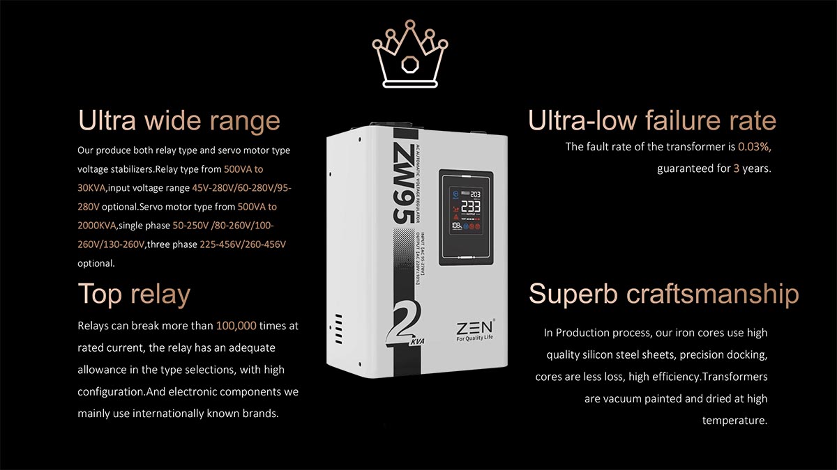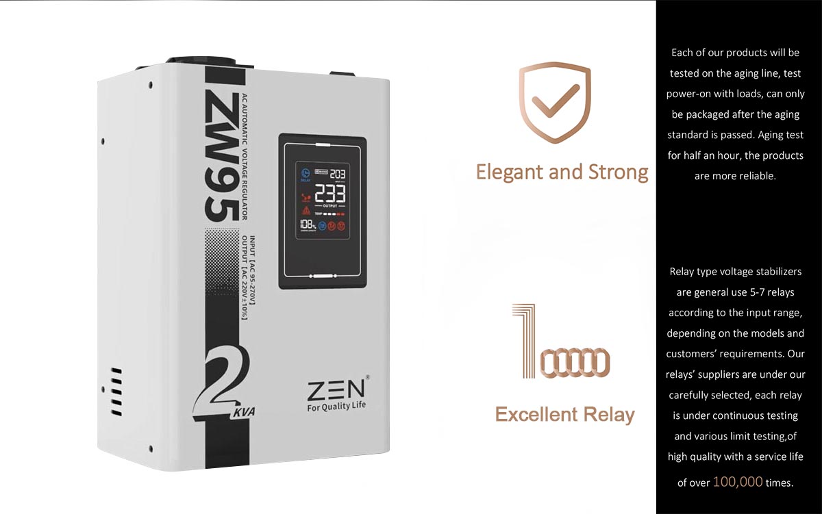 As marcas de regulador automático de tensão CA ZW95 1KVA a 30KVA de alta qualidade da fábrica da ZEN Machinery são conhecidas por sua alta qualidade e confiabilidade, tornando-as uma escolha popular para aplicações residenciais e industriais. Recursos do produtoEste modelo é um regulador de pequena tensão de 220 V totalmente automático projetado para display digital LED portátil. Possui características de tamanho pequeno, peso leve, ajuste rápido de tensão, sem distorção de forma de onda e assim por diante.